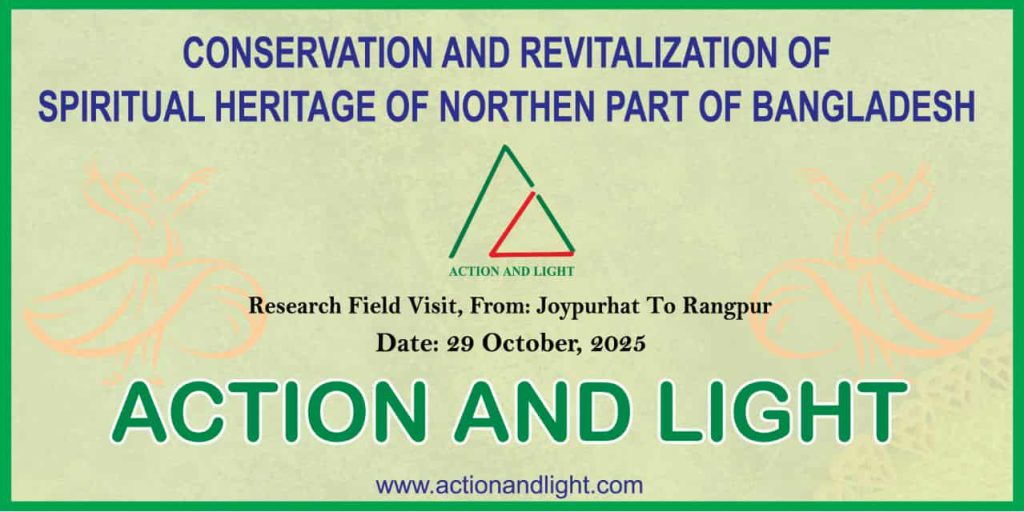 Date: 29 October 2025Location: Joypurhat – RangpurProgram: Conservation and Revitalization of Spiritual Heritage of Northern Part of BangladeshStatus: Self-financed Initiative by Action and Light Overview Today, Action and Light conducted a research field visit from Joypurhat to Rangpur as part of its ongoing self-financed research program titled “Conservation and Revitalization of Spiritual Heritage of Northern […]